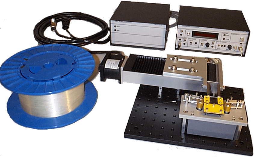 The two-point bend test method involves placing a ring of optical fiber bent more than 180 degrees between two parallel platens with grooves cut into the platens to hold the fiber in place. The platen is moved by a computer-controlled stepper motor translation table (at a set constant rate). When the fiber is broken, the stepper motor is stopped by an acoustic detection looper, and the computer software calculates the fiber fatigue and related data from the platen spacing.