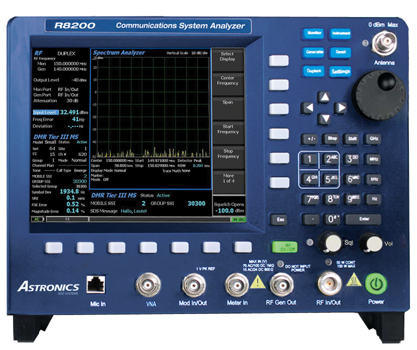 The Freedom R8200 from Astronics Test Systems represents a major step in the evolution of the Land Mobile Radio Test. The Freedom R8200 is the first and only test instrument that combines comprehensive digital and analog LMR testing with the ability to measure important RF network characteristics, such as Distance to Fault (DTF), Return Loss, and Voltage Standing Wave Ratio (VSWR).