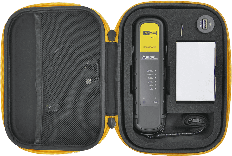 RadMan Personal Protection Meter is a portable test and alarm device, mainly used for timely and safe alarm protection of electromagnetic radiation, suitable for carrying around, as long as the maximum exposure limit of 50% is exceeded, the meter will beep the alarm. Also equipped with headphones, convenient for users in noisy environments. Five levels of indicators provide separate warning displays for exceeding radiation power densities of 5 %, 10 %, 25 %, 50 %, 100 % and 200 %.