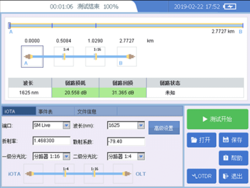 支持在线测试波长 1490,1625,1650nm,动态范围高达 40dB,最高能够穿通 1:128 分光器